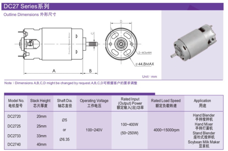 우리의 브러시 직류 전동기는 7.2 ~ 230V와 40~100,000rpm의 더 레인지로 맞추어질 수 있고, 완전히 다음과 같은 가전 제품, 자동화, 의료적 치료와 동력 공구의 분야에서 사용됩니다 : 핸드 믹서, 커피 머신, 진공 청소기, 로봇, 기타 등등